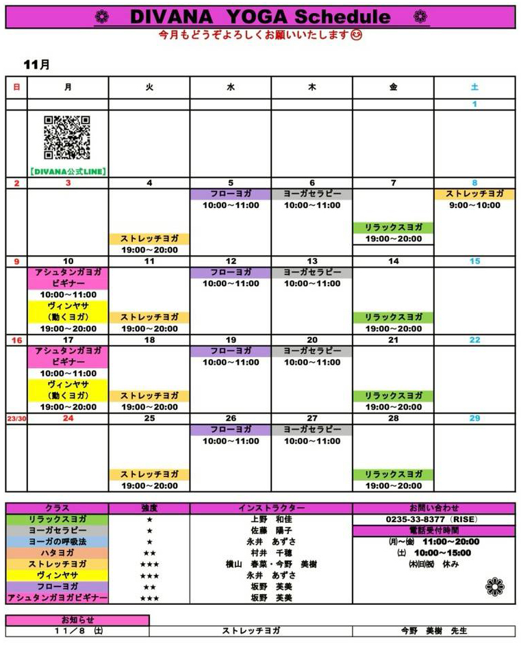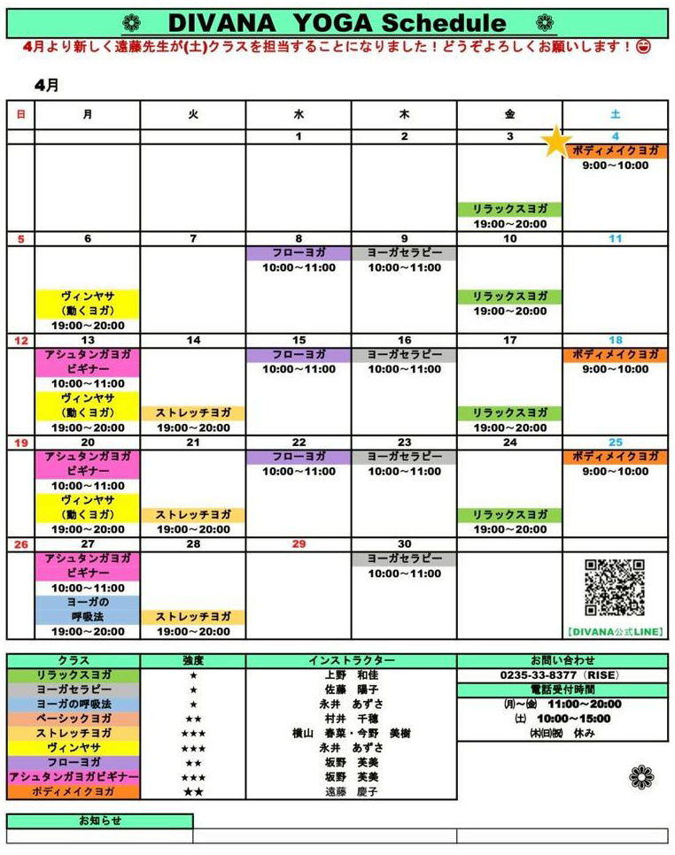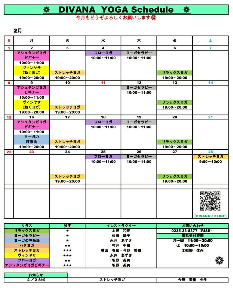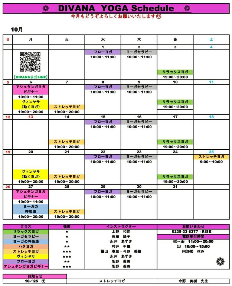 Divana(ディヴァーナ)は2019年11月より、ヨガスタジオとして活動しています。身体、内なる感情、そして精神の旅が融合したものが、私たちのスタジオの基盤となる考えです。身体の動きと呼吸、そして瞑想的な意識を合わせることによって、ご自身の健康において、あらゆる要素が繋がっているという意識が深まります。 リラックス・ヨガ運動量が低いリラクゼーションを目的としたクラスです。ゆったりとした動きと優しいポーズで、心も体も柔軟にします。初心者の方や体の硬い人も楽しめるクラスです。強度レベル★ ベーシックヨガベーシックヨガは、伝統に基づきポーズと呼吸を行うクラスです。心を落ち着かせ、日々のストレスからあなたの身体を守ります。強度レベル★★ アシュタンガ・ヨガ当クラスはDivanaで最も強度の高いクラスとなります。アシュタンガヨガは呼吸(胸式呼吸)と体の動きを連動させてダイナミックに体を動かし、決められたポーズを順番に行っていきます。レッスン中に聞こえるのはインストラクターのカウントと呼吸音だけです。 強度レベル★★★ 公式LINE 会員申込 公式FBページ トレーニングジムRISEの情報はこちら